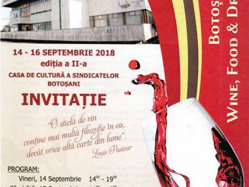 S.C. Diasos Top Distrib SRL, cu sprijinul Camerei de Comerț, Industrie și Agricultură Botoșani, organizează Wine, Food&Drinks Festival ediția a II-a în perioada 14-16 septembrie 2018, la Casa de Cultură a Sindicatelor Botoșani.