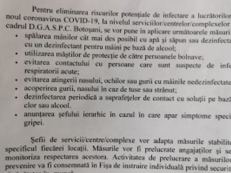 În contextul existenței virusului COVIT-19 în România, la nivelul Direcției Generale de Asistență Socială și Potecția Copilului Botosani au fost stabilite mai multe măsuri de prevenire în scopul asigurării protecției beneficiarilor și a securității si sănătății tuturor angajaților.