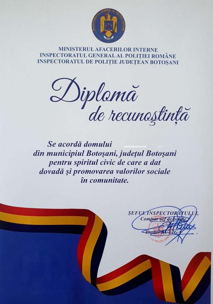 Inspectoratul de Poliție Județean Botoșani a oferit diplome de recunoștință unor cetățeni ai municipiului Botoșani pentru spiritul civic de care au dat dovadă în momentul în care au asistat la comiterea de fapte antisociale.