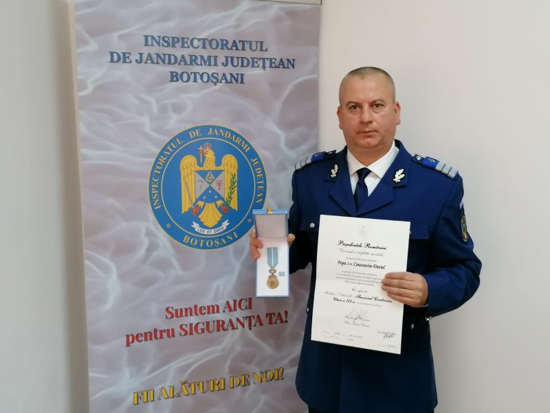 Cu această ocazie, Dan Nechifor, prefectul județului Botoșani, i-a înmânat subofițerului jandarm Medalia Națională „Serviciul Credincios” Clasa a III-a, cu însemn pentru militari, precum și brevetul prin care președintele României, Klaus-Werner Johannis, i-a conferit această medalie în semn de apreciere pentru contribuția importantă adusă la îndeplinirea cu succes a misiunilor specifice Ministerului Afacerilor Interne.