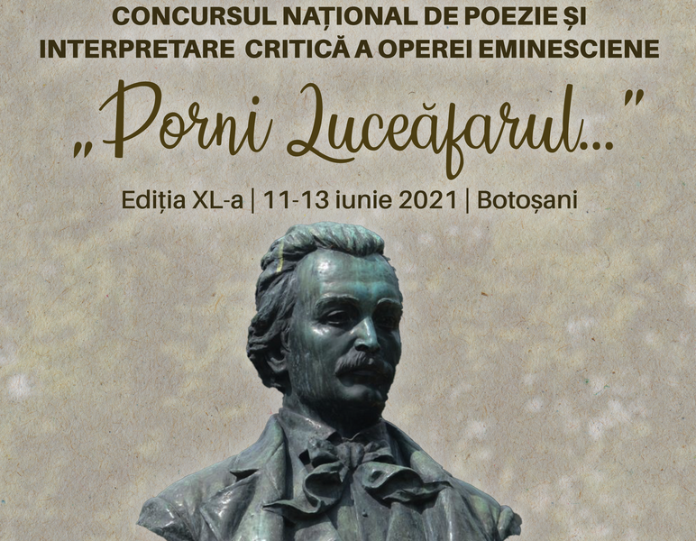 Centrul Județean pentru Conservarea și Promovarea Culturii Tradiționale Botoșani face cunoscută cea de-a XL-a ediție a Concursului de Poezie și Interpretare Critică a Operei Eminesciene „Porni Luceafărul…”, care se va desfășura la Botoșani în perioada 11-13 iunie 2021.