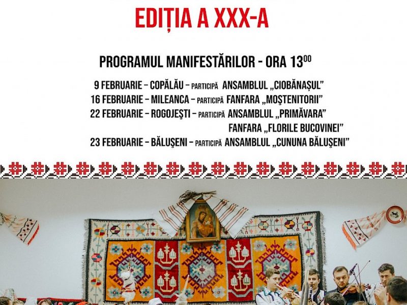 Consiliul Judeţean Botoşani, Centrul Judeţean pentru Conservarea şi Promovarea Culturii Tradiţionale Botoşani, în colaborare cu Primăria Comunei Copălău, Primăria Comunei Mileanca, Primăria Comunei Cândeşti şi Uniunea Ucrainenilor din România – Filiala Rogojeşti, Primăria Comunei Băluşeni, organizează – în perioada 9 – 23 februarie 2020 – „Șezătorile iernii”, ediția a XXX-a, manifestare culturală de tradiţie cu o largă participare a comunităţilor săteşti din judeţ.