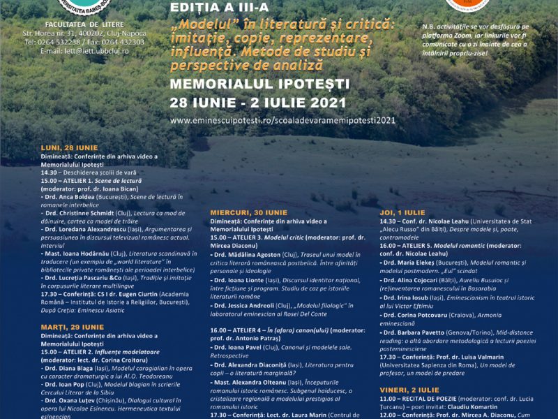 În perioada 28 iunie – 2 iulie 2021, așa cum a fost anunțat anterior, Memorialului Ipotești – Centrul Național de Studii „Mihai Eminescu” și Departamentul de literatură română și teoria literaturii, Facultatea de Litere, Universitatea Babeș-Bolyai din Cluj organizează a treia ediție a Școlii de vară pentru tinerii cercetători filologi (doctoranzi și masteranzi). Ediția din acest an va avea ca temă de reflecție: „Modelul” în literatură și critică: copie, imitație, reprezentare, influență.