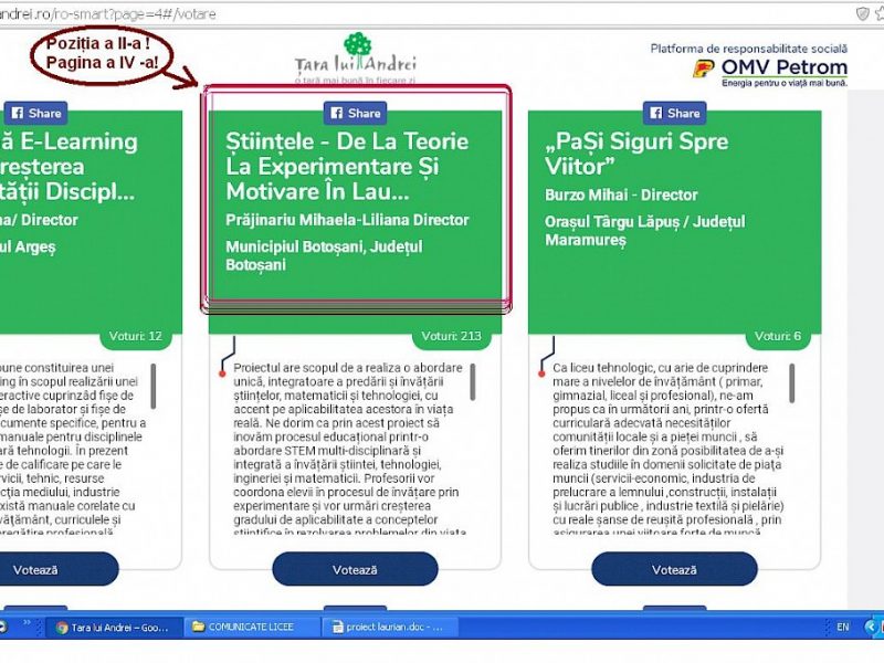 Aşadar, pentru ca metodele cele mai moderne din educaţie să fie aplicate cu succes şi la Botoşani, laurienii au nevoie de votul tuturor. Susţinătorii trebuie să aibă la dispoziţie două minute pentru a-şi crea cont pe platforma „Ţara lui Andrei”, pasul următor fiind identificarea şi votarea proiectului depus de Laurian, pe poziţia a II-a din pagina a IV-a a proiectelor educaţionale. Mult succes!